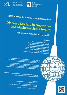 This summer school is organized by the Berlin Mathematical School and the SFB/TRR 109, Alexander Bobenko and Yuri Suris. It combines various current research topics in geometry and mathematical physics, the unifying theme being the role of discrete models and of intelligent discretization methods.